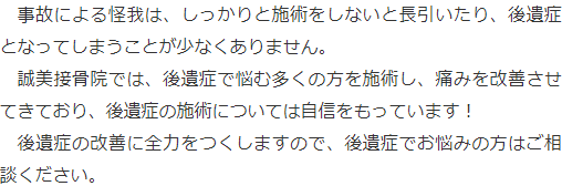 後遺症でお悩みの方は、誠美接骨院にご相談ください。